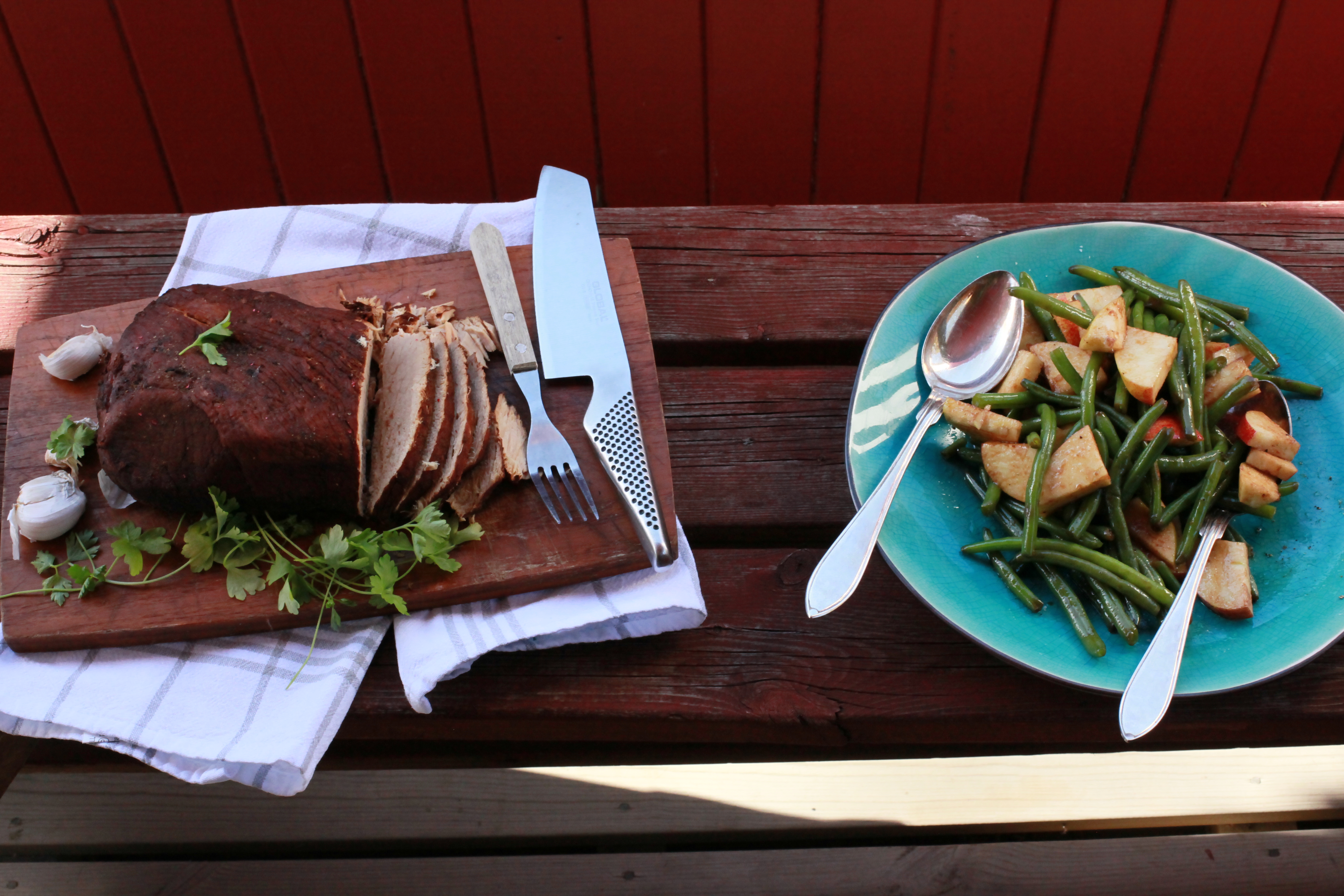 Eftersom jag var ledig från jobbet myste jag ned mig i soffan och tittade på ”Vad blir det för mat?” med Per Morberg. Jag älskar att se honom laga mat! Det är rejäla råvaror, okonstlat och underhållande. Och när jag tittar på herr Morberg blir jag alltid sugen på att laga riktigt rustik mat. Så jag fick ett infall, gick ned i köket och tog fram en skinkstek ur frysen, värmde upp min vackra emaljerade gryta från Le creuset och googlade efter inspiration. Jag hade en skvätt rött vin i kylen efter att ha bjudit ett par vänner på middag så den ville jag använda.