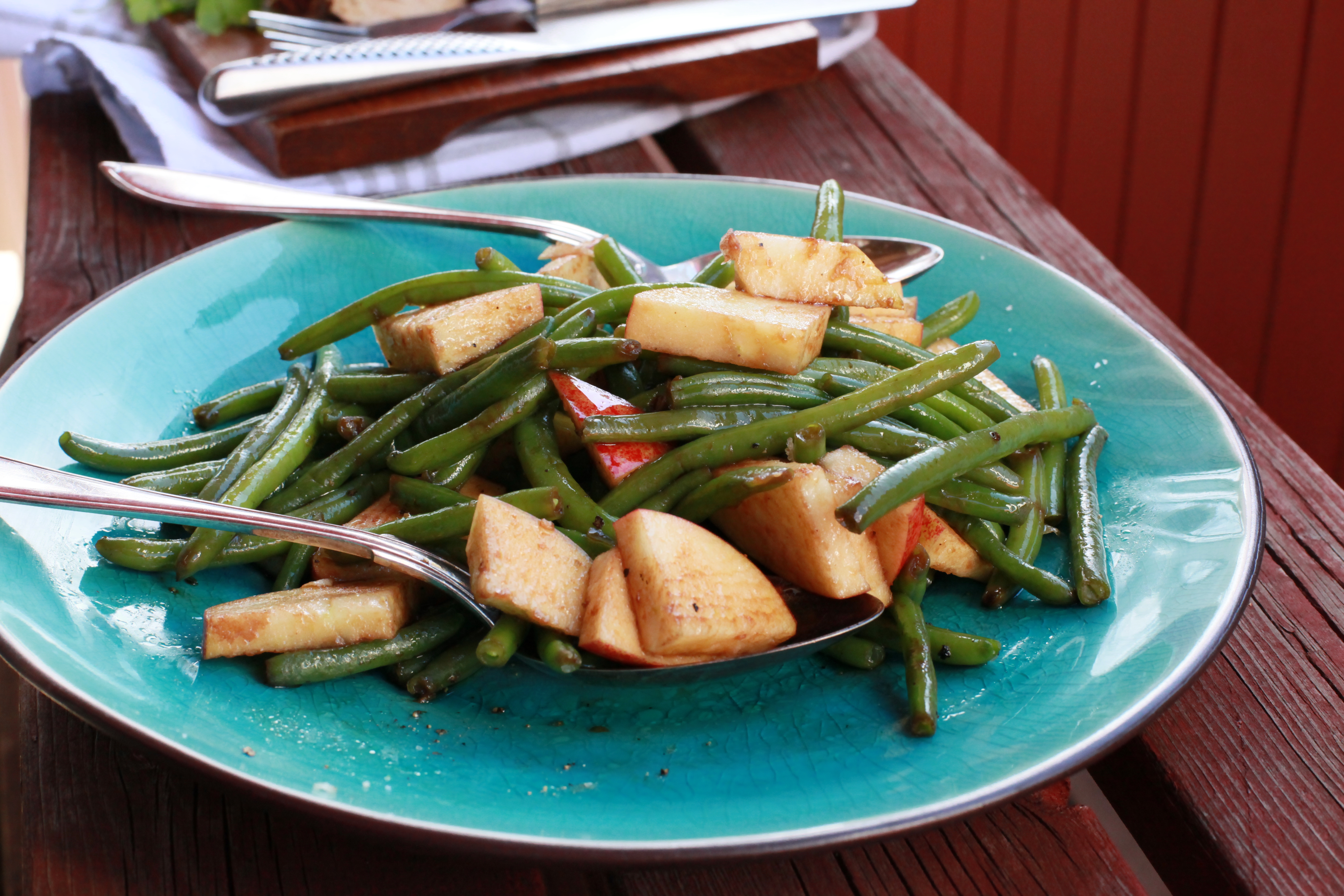 Koka haricot verts enligt instruktioner på förpackningen i lättsaltat vatten. Skölj äpplet, tag bort kärnhus och skär först i halvmånar och dela sedan en gång till, ganska stora bitar. Lägg dina kokta haricot verts på en tallrik tillsammans med äppelbitarna. Ringla över lite olivolja och balsamvinäger. Strö över lite salt och peppar och blanda om.