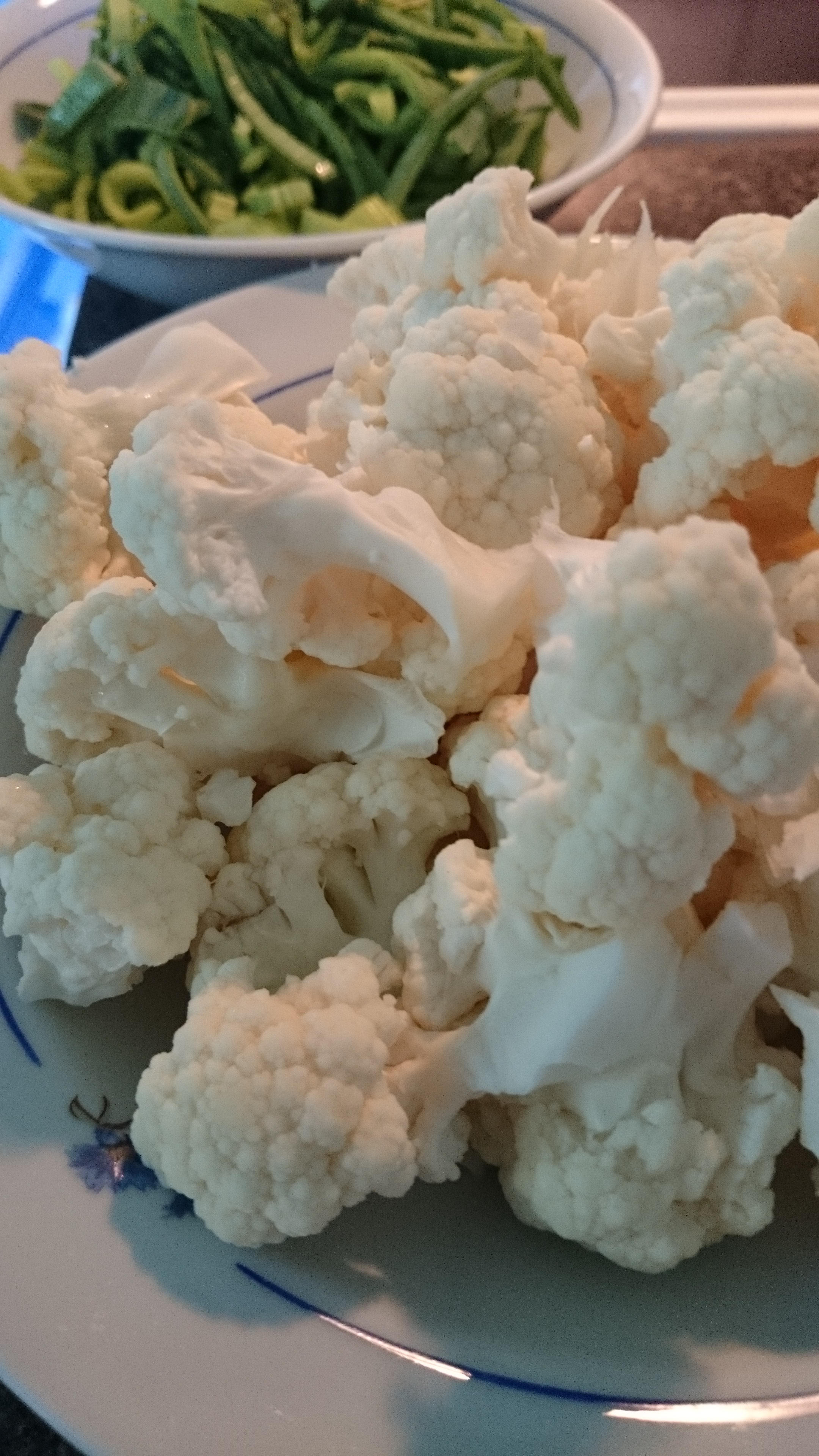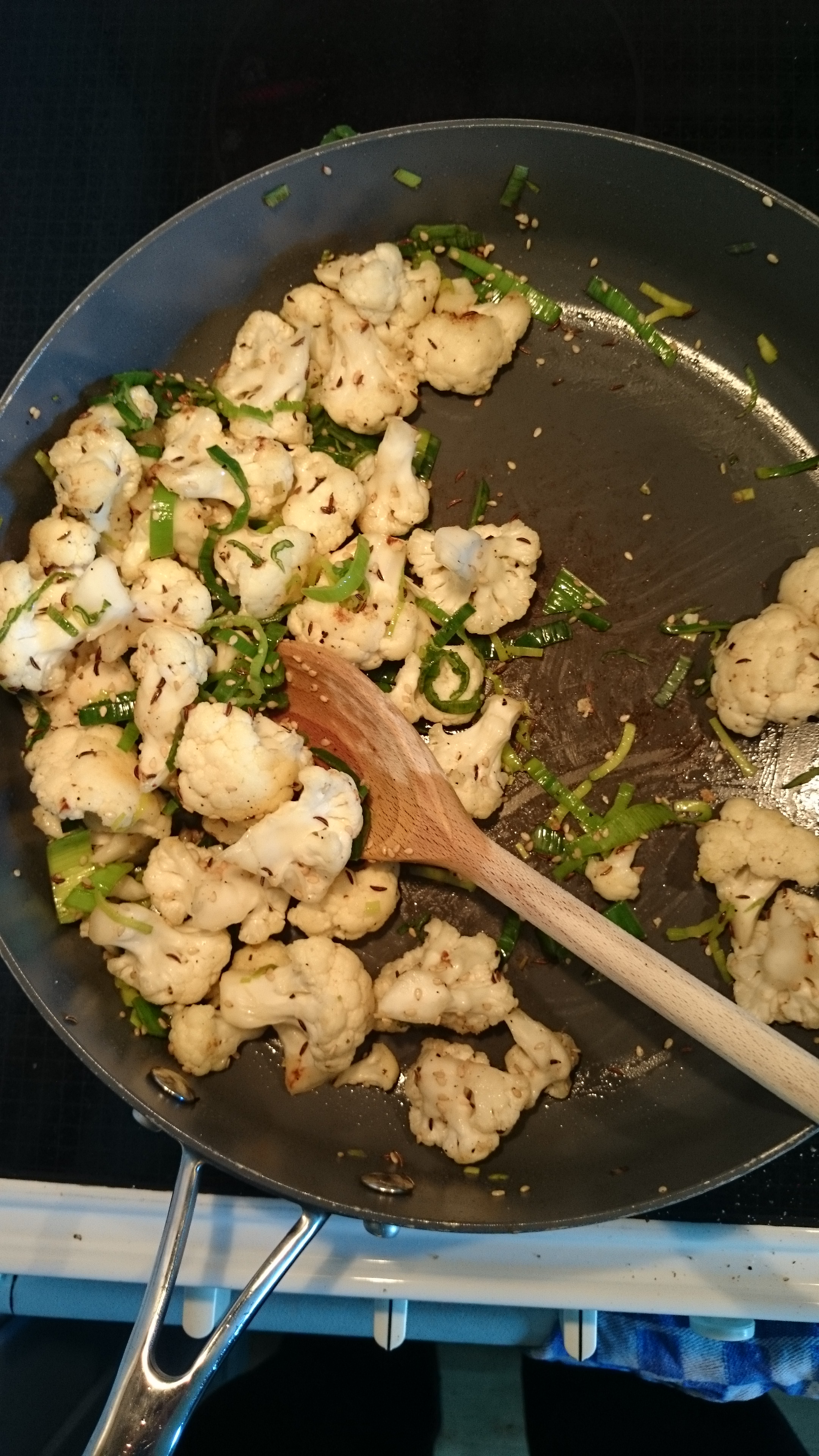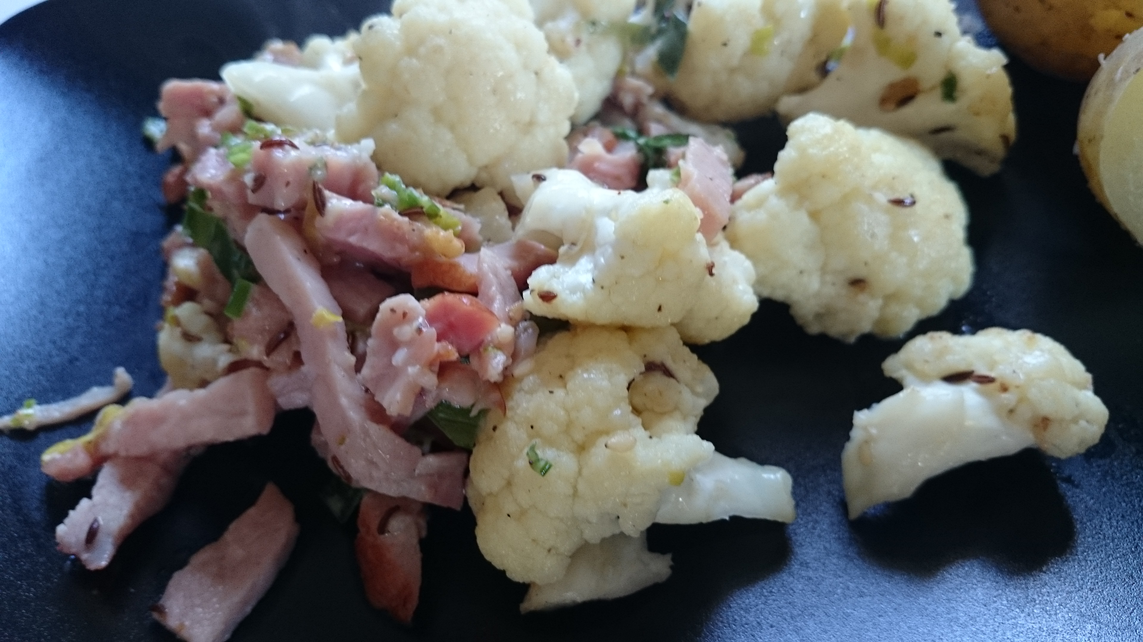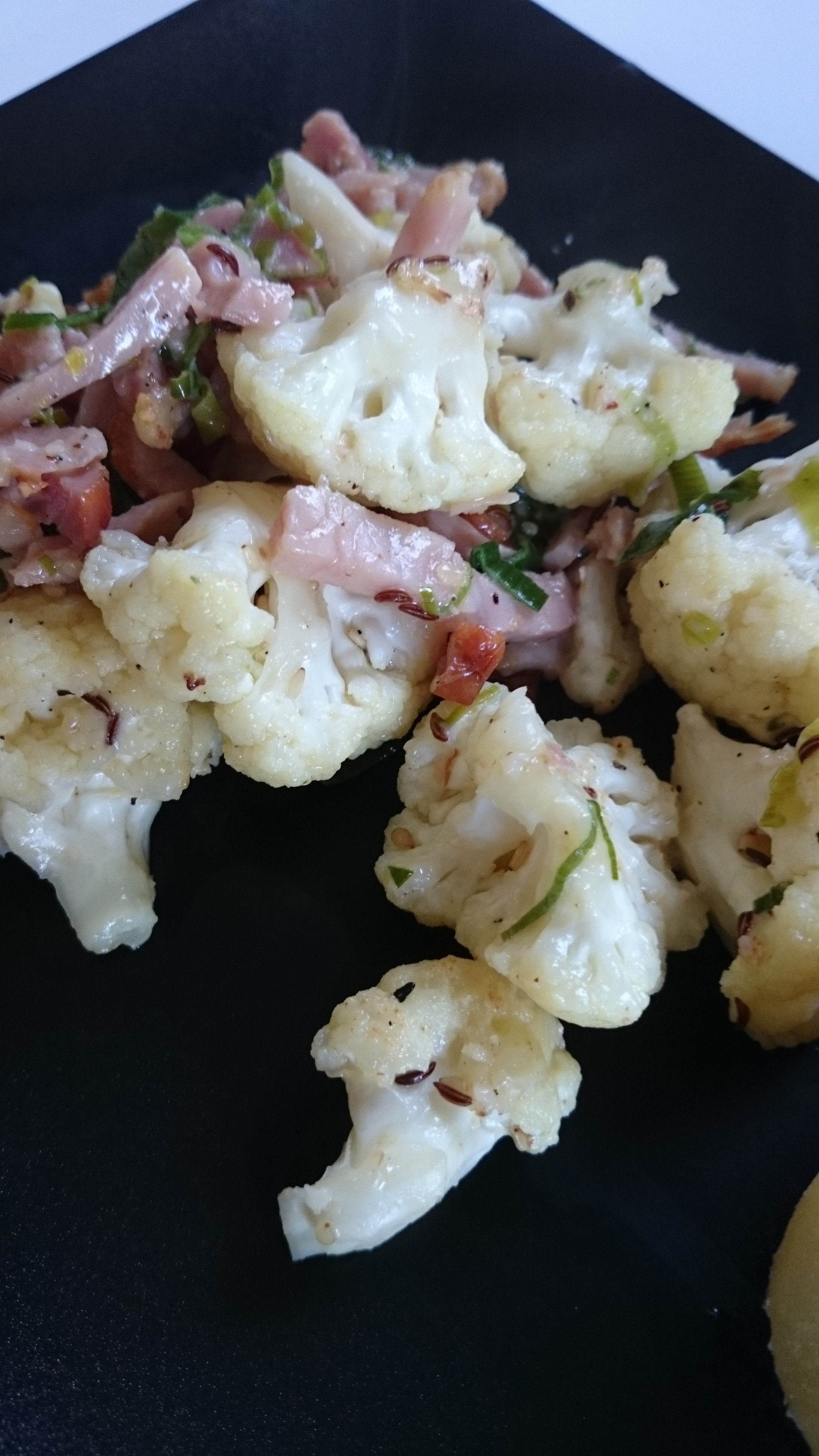 Häromdagen svängde jag ihop den här goda blomkålsrätten – jag hade potatis till, på tal om kolhydrater. Inspiration har jag fått från den härliga bloggen Det gröna skafferiet. Snabblagat och smakrikt. En gång testade jag ett liknande recept av Jamie Oliver. Jag har fyra av hans kokböcker och älskar hans recept. Det kluriga är dock att två av dem är franska översättningar som jag köpt på en resa till Paris för att underhålla min franska. Min franska är rätt bra men att laga mat samtidigt som man fräschar upp sina språkkunskaper visade sig vara en ganska jobbig uppgift med alla kökstermer och annorlunda mått inblandade. Därför gick det som det gick. Det här receptet gick betydligt bättre att laga efter.