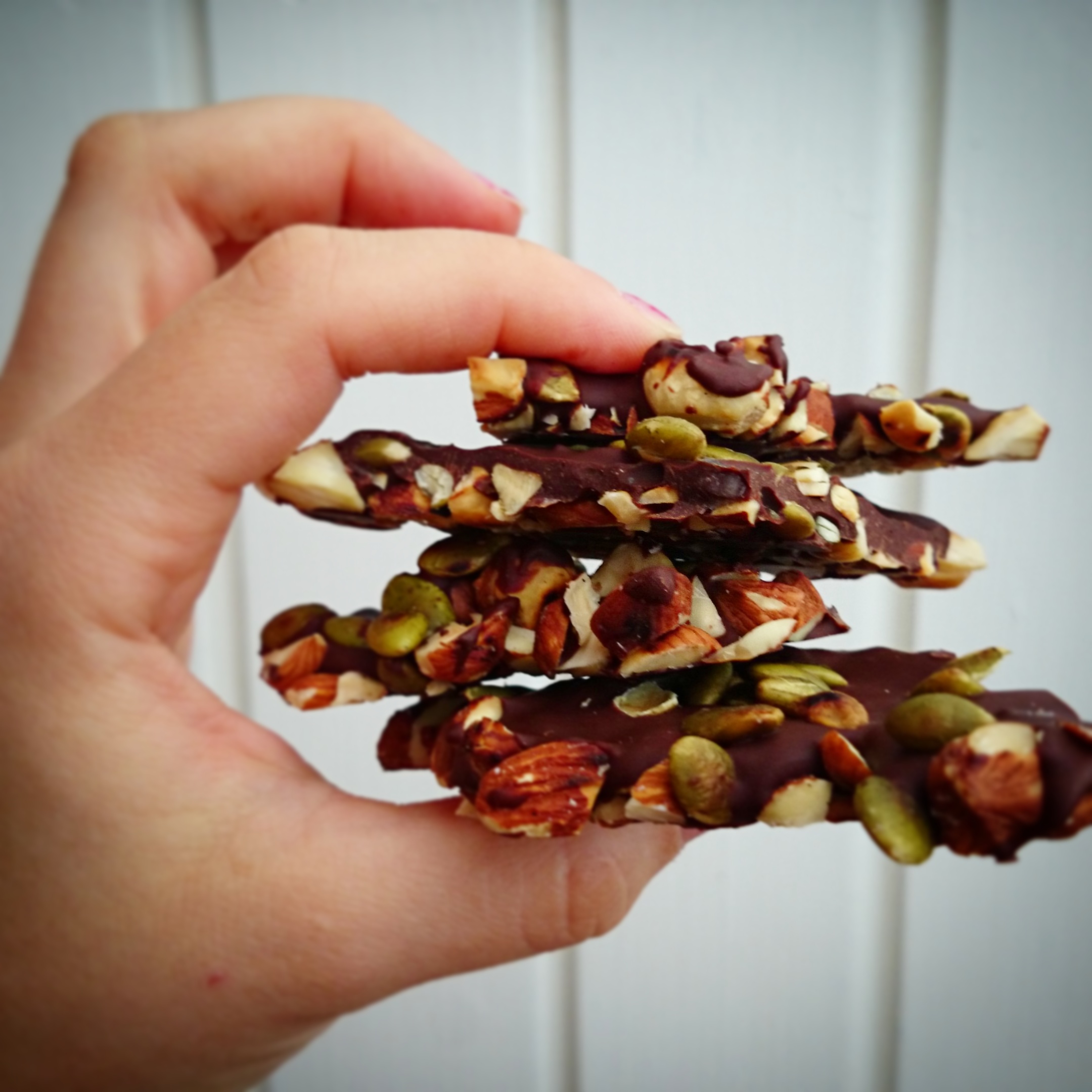 5. Smält ca 25 g choklad (ju finare choklad desto godare kakor såklart. Jag tog mörk choklad). Tag fram tallriken eller brickan ur frysen, lägg mandlar och hasselnötter tätt tillsammans och ringla över chokladen så att den täcker och binder samman nötterna. Strö sedan på de rostade pumpafröna och ställ in i kylen tills chokladen stelnar. Bryt i bitar och njut – utan skuldkänslor.