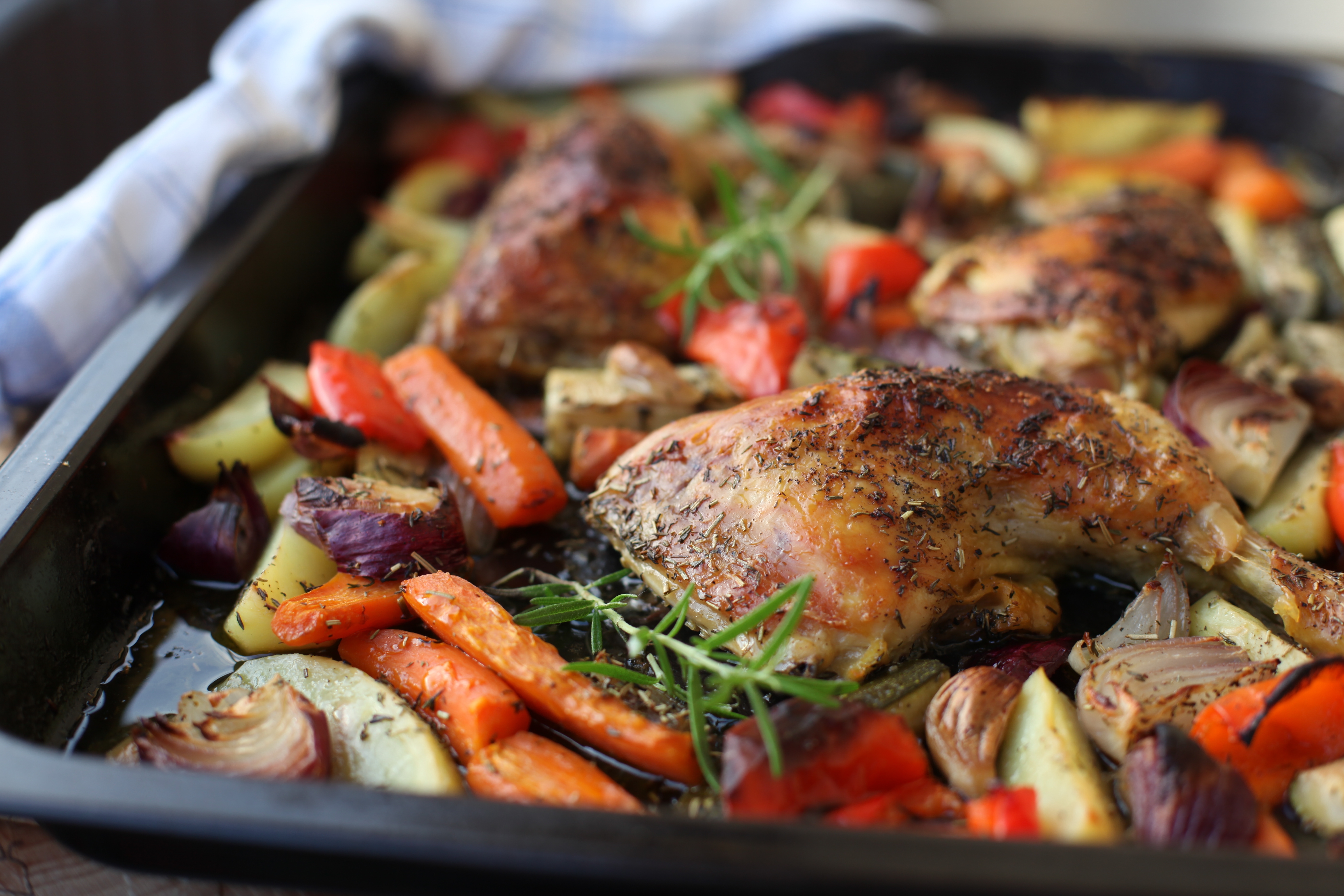 - Skölj zucchinin och skär i långa bitar. Skala rödlök och skär i klyftor. Skölj och ansa paprika och skär i grova bitar. Skala morötter och skär i långa bitar. Skala potatisen och skär i klyftor. Skala vitlöksklyftor. Blanda alla grönsakerna i ugnsplåten. Krydda med salt, peppar, timjan och rosmarin. Häll över matlagningsvin och sätt in plåten i ugnen. Tillaga 50-60 minuter (sänk eventuellt värmen mot slutet). Maten är klar när kycklingen ä genomstekt!