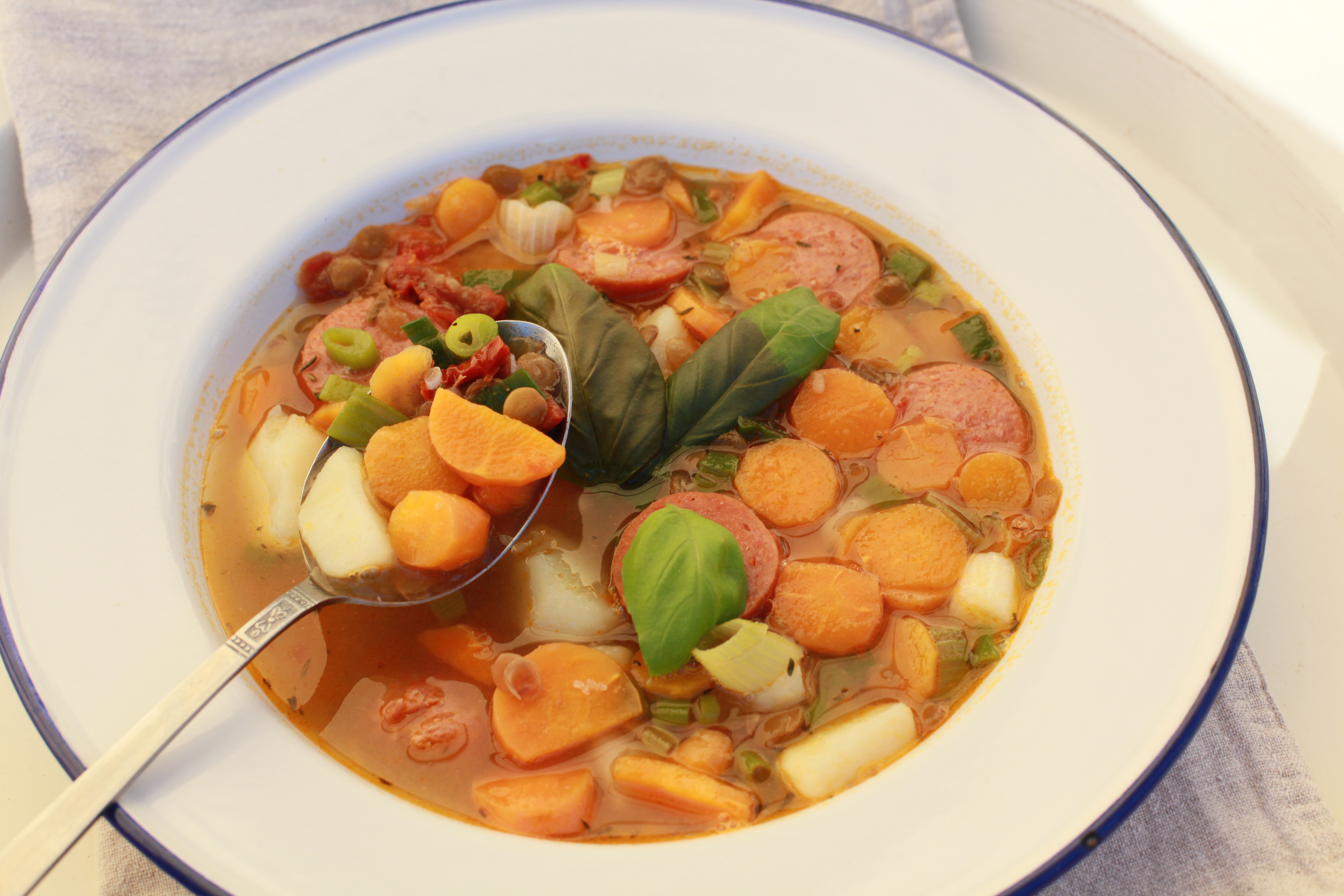 Är man lite tveksam till baljväxter men ändå känner att man skulle vilja ha in dem i kosten på något sätt så tror jag det är ett bra sätt att servera dem tillsammans med kött, som i den här soppan. Det här måste ju vara det perfekta sättet att presentera linser för någon som älskar korv! Det är ju säkert ingen nyhet att det är bra att äta mindre kött och mer grönsaker och baljväxter – men det betyder faktiskt inte att du MÅSTE äta en helt vegetarisk måltid! Du kan ju faktiskt minska mängden kött i din måltid till fördel för linser, bönor, ärter, eller grönsaker och rotfrukter. Ett bra sätt att ”lura i” lite mer vegetabilier utan att någon ska behöva känna sig som en ”kanin”….