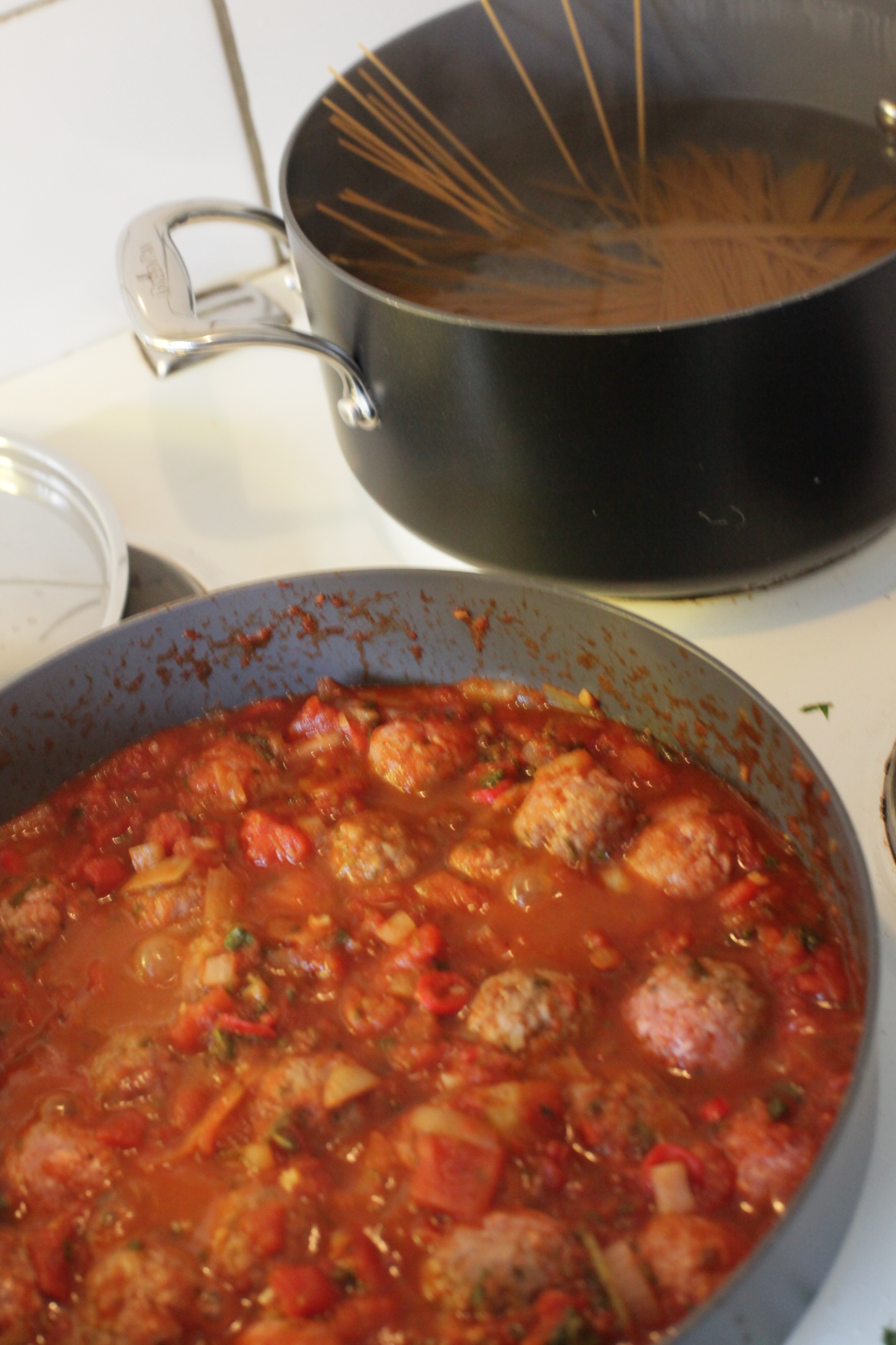 - Rulla köttbullar och lägg direkt ned i den puttrande tomatsåsen. Vänd försiktigt runt köttbullarna och skaka pannan så att de täcks av tomatsåsen så mycket som möjligt. Lägg på lock och sänk värmen och låt puttra medan du kokar pastan och broccolin.