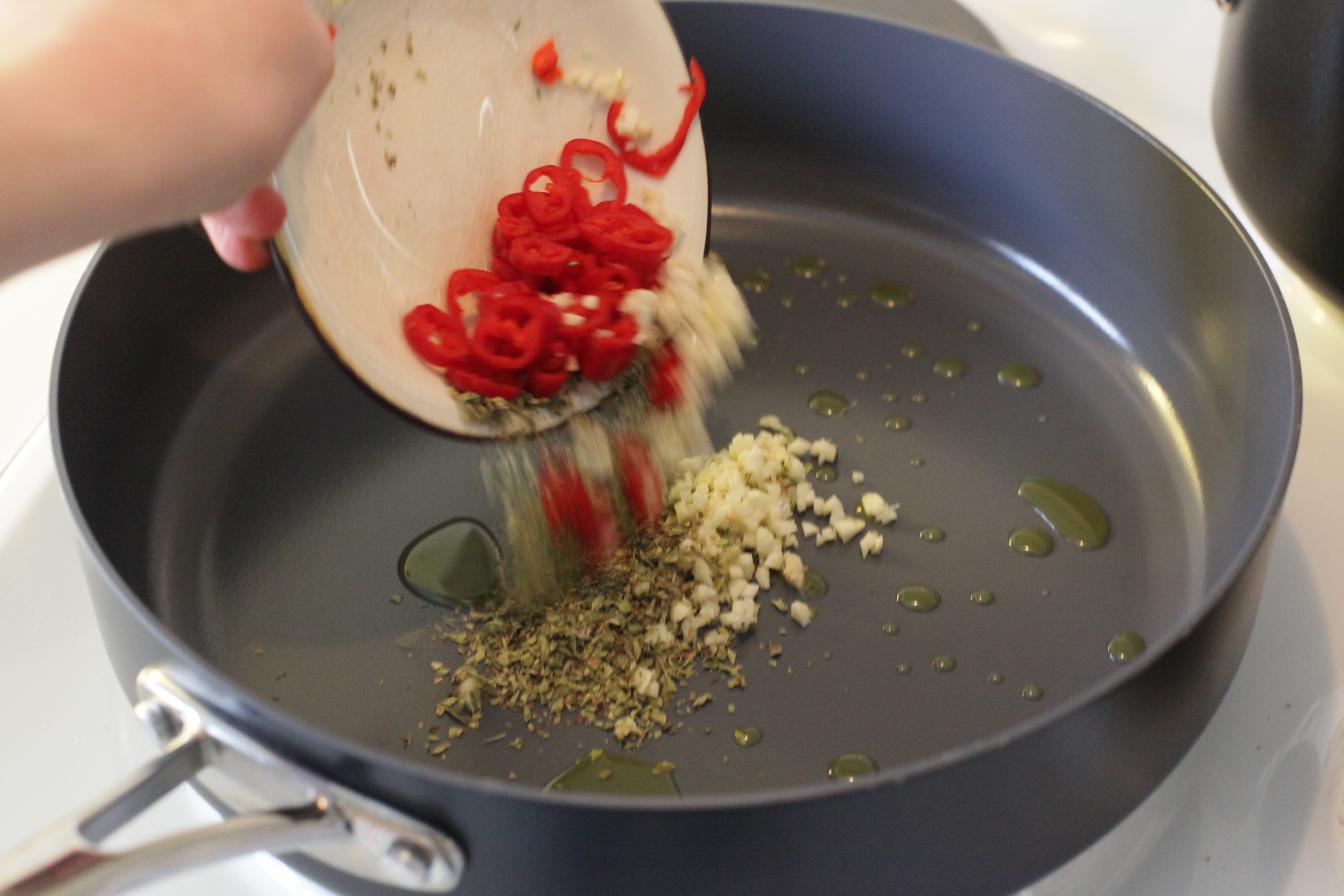 - Börja med tomatsåsen. Värm en stor stekpanna/traktörpanna på spisen på medelvärme. Skölj, ansa och finhacka chili och vitlök. Skala och hacka gul lök. Skölj och hacka basilikabladen.