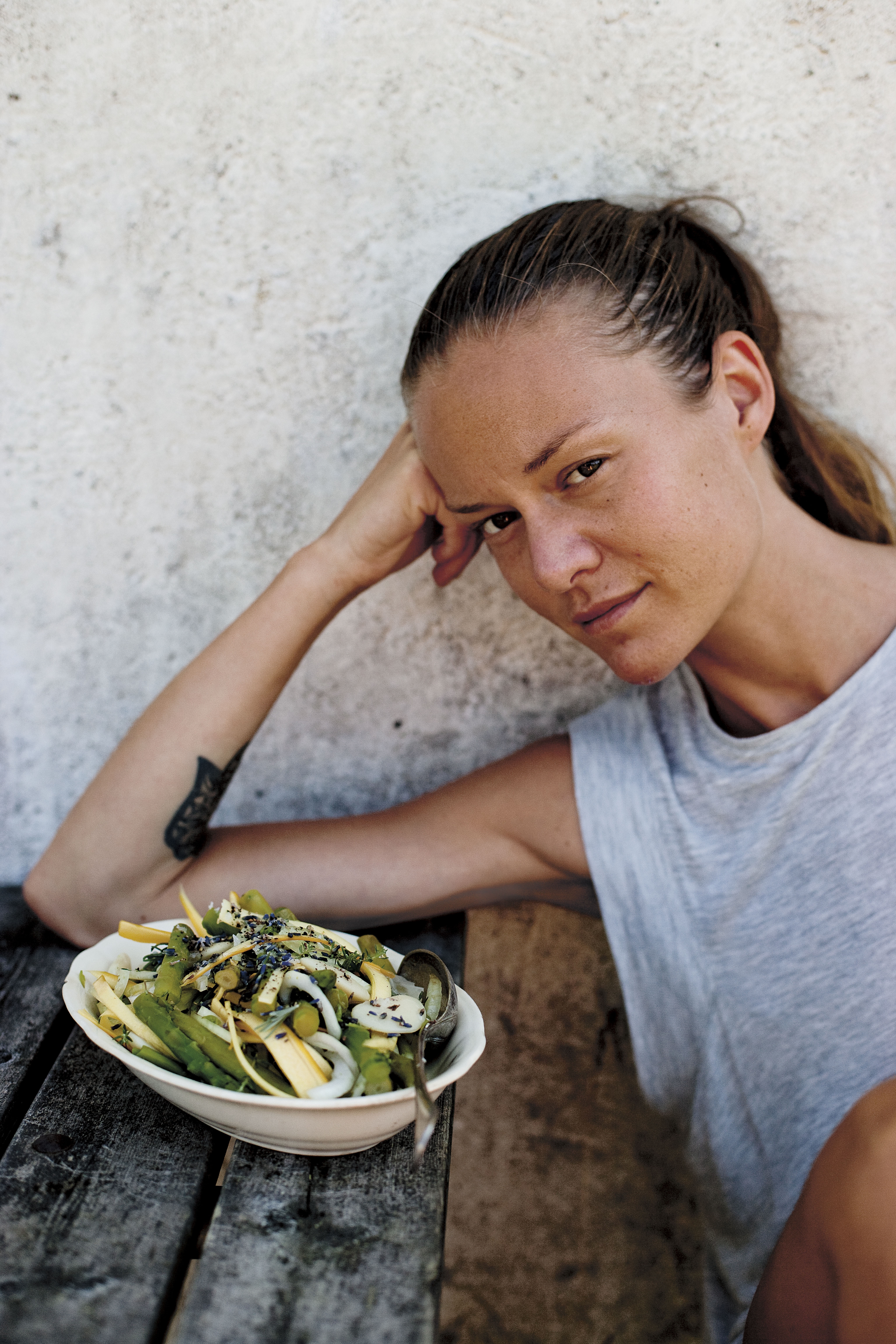 Formgivningen är To Die For. Om jag skulle göra en kokbok skulle jag nog vilja att den ser ut såhär. Stilrent men lekfullt i ett. Mycket tydliga och lättlästa recept, vackra bilder med bildtexter som gör det lätt att veta vilket recept bilden hör till. Vissa recept saknar bilder, vilket jag brukar störa mig på, men eftersom alla ”större” recept har bilder och det mest handlar om dressingar och såser som inte har egna bilder så tycker jag inte att det stör. Stora rubriker gör det lätt att få överblick. Pricken över i är väl alla opretentiösa porträtt på författarinnan, fotografier som andas sommarhetta och äkthet.