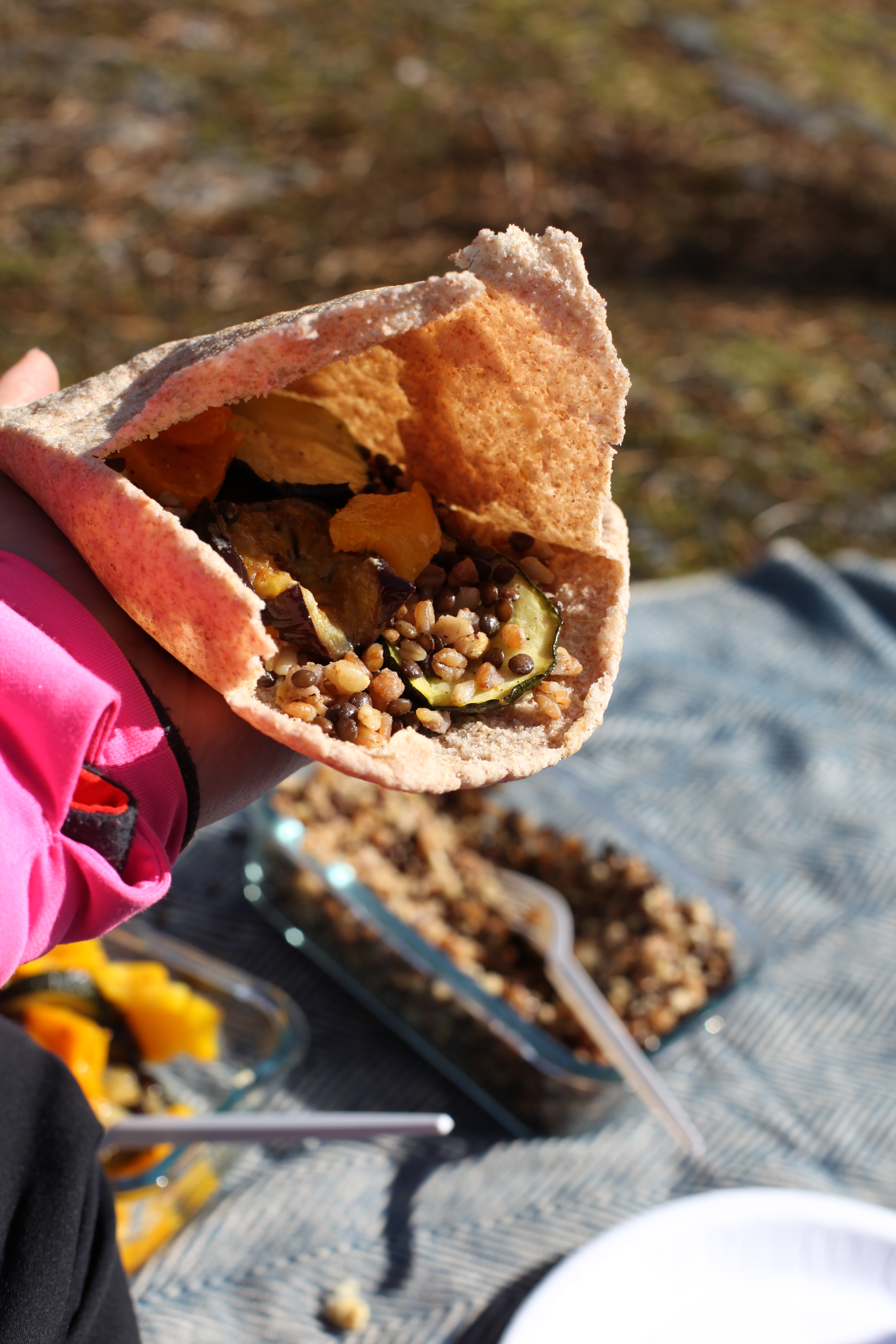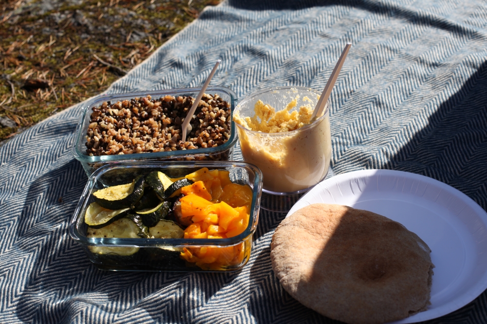Jag hade fixat grillade grönsaker, hummus och en ”sallad” av kvarngryn och belugalinser som vi åt i pitabröd. Och så hade vi kaffe och en bakelse med oss.