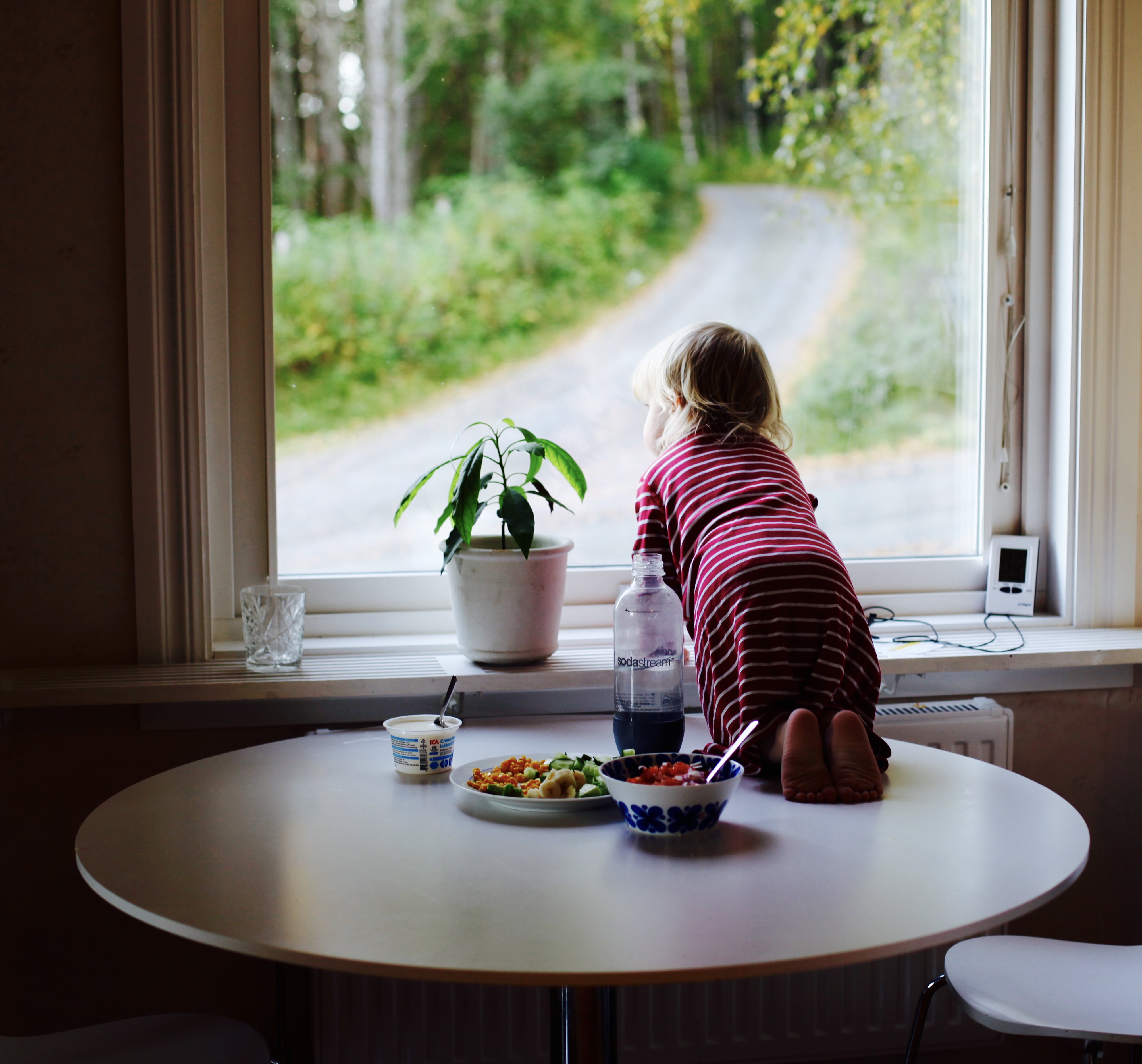 Att laga mat är en spännande historia när man får hjälp av Viggo. Där stod jag och dansade fram och tillbaka över köket och parerade Viggos försök att roffa åt sig alla grönsaker jag skar upp, blöta ned hela sig under kranen och hugga tag i kökskniven. Tusen frågor i stil med ”är det där då?” och nästan lika många svar. Innan maten var färdig och stod på bordet så hade Viggo ätit sig mätt på alla grönsaker och var därför ointresserad nog av mat för att vara trotsig till tusen, hoppa runt på alla stolar medan jag gjorde detsamma i ett försök att göra honom nöjd, klättra upp på bordet för att få tag i alla grönsaker och slicka på alla skedar. Viggo klättrar upp, mamma plockar ned.