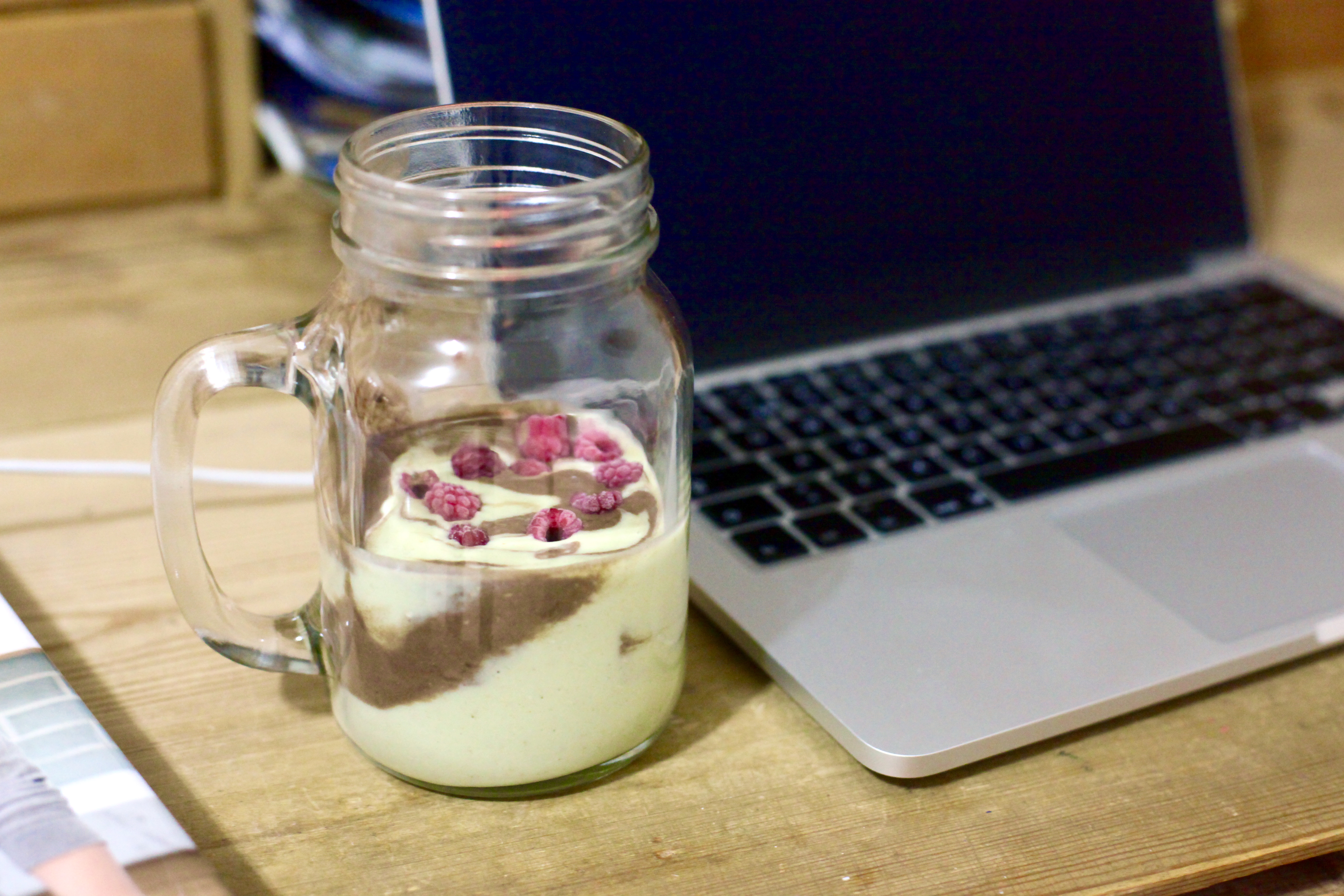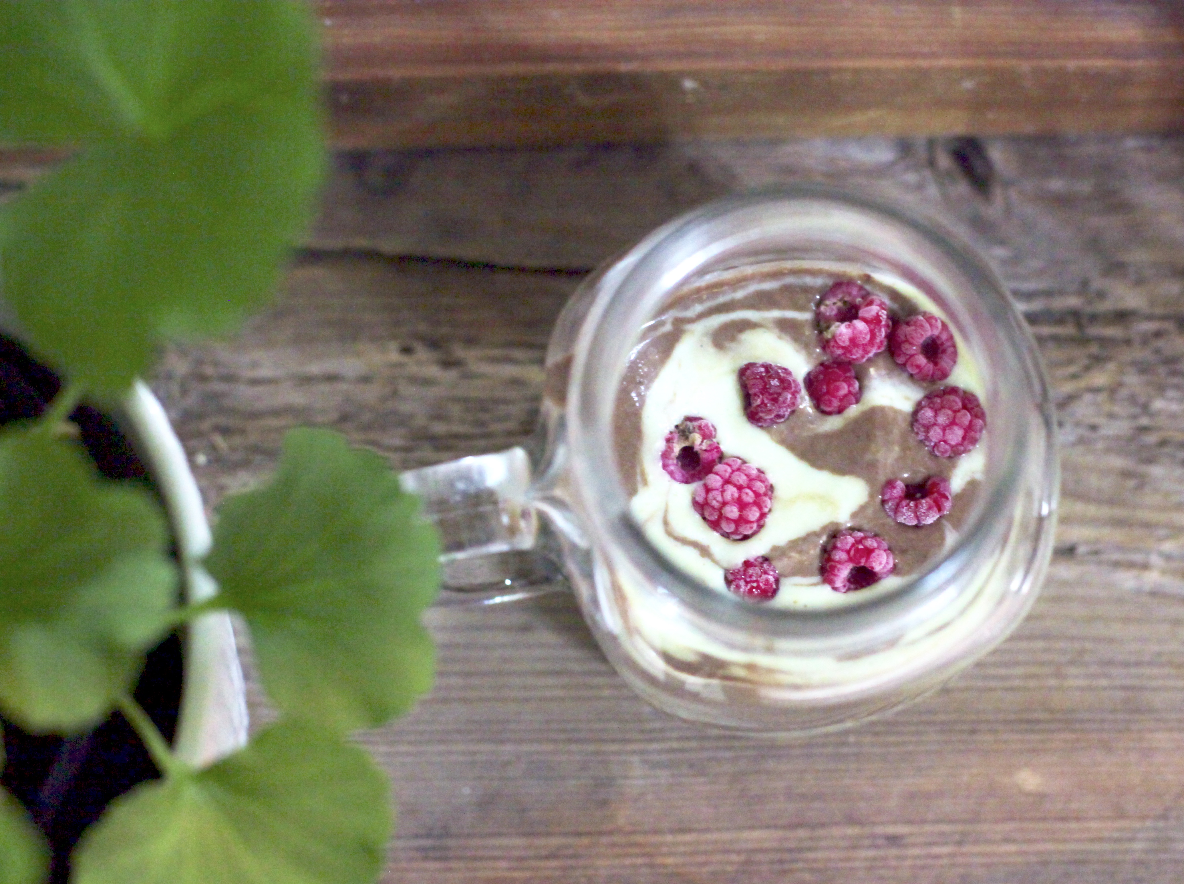 - Mixa (fryst) banan, jordnötssmör, havregryn, vanilj och avokado. Dela upp smoothien i två delar och blanda i kakao i en del. Häll sedan de båda delarna växelvis i ett glas för en vacker effekt, och toppa gärna med hallon.