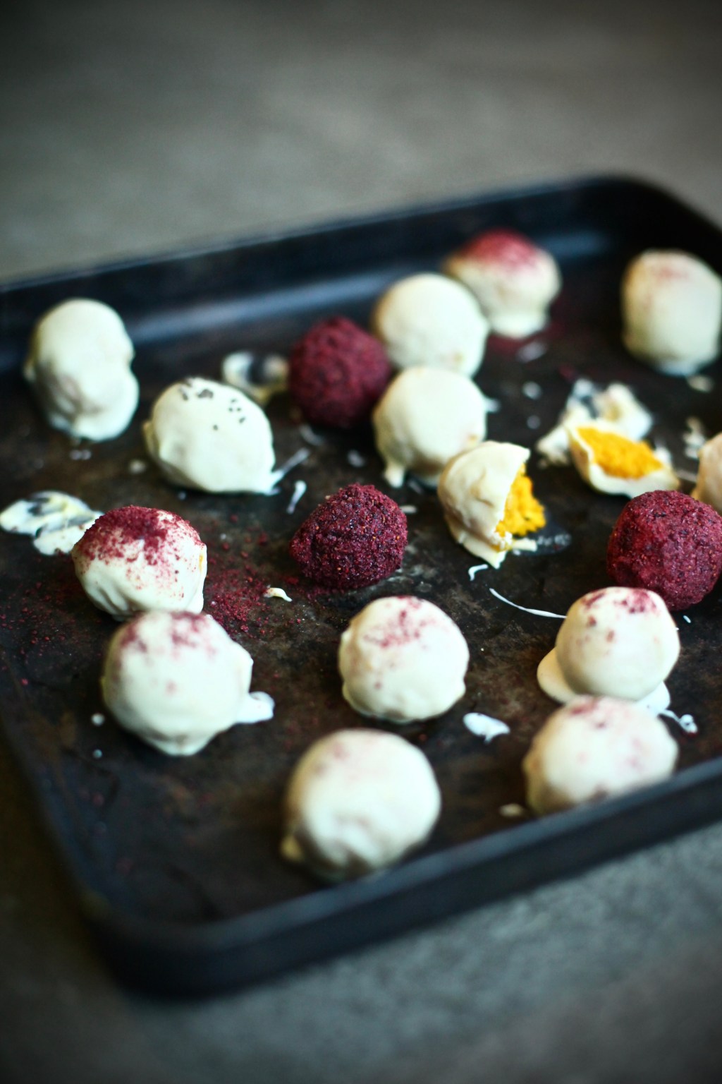 - Rulla/doppa bollarna i chokladen och lägg tillbaka på en bricka. Strö eventuellt över kokosflingor, kakaonibs eller annan fin topping som dekoration och låt stelna i kylskåp.