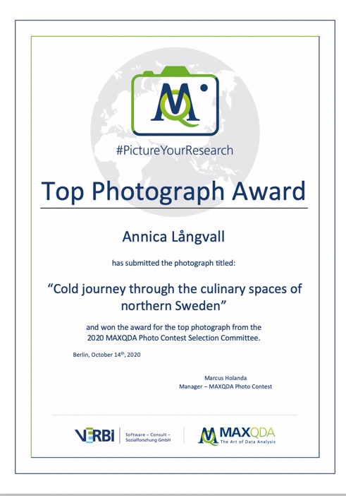 Fotografiet kommer att delas i MAXQDAs sociala medier vilket såklart har betydelse för att sprida min forskning. Jag vann också ett liten prissumma. Det som framförallt glädjer mig med priset är dock att det erkänner värdet av att vara kreativ i sin forskning, och att jag lyckats beröra andra med ett foto som betydde mycket för mig själv och min forskning. Jag som person drivs enormt mycket av ett slags skaparlust – att skapa foto, att skapa text och att skapa kunskap tillsammans med de personer som deltar i forskningen. Forskning är så mycket mer än statistik och labprover – det kan också handla om att låta röster höras och platser att synas.