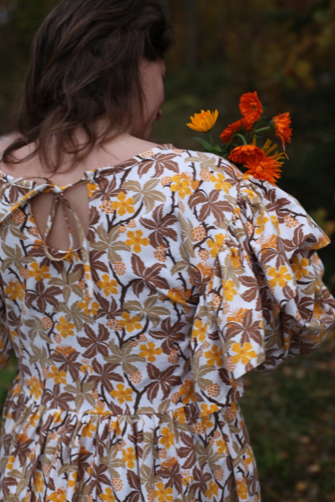 De helblå partierna blev volanger i dubbelt tyg, inspränga mellan de vackra kurbitsmönstren. Det var något av en chansning att klippa isär överdelen och hoppas på att jag skulle kunna foga ihop dem rätt med volangen emellan, men det lyckades. De tunna, vita partierna var översållade med små blommönster och avslutades med en tunn blå rand som utgjorde en naturlig avslutning på de vida änglaärmarna. När jag började klippa i tyget hade jag sett en klänning framför mig, men när jag sytt överdelen och provat ut den så klippte jag av den under bysten och sydde på en lång avslutning. Nu är den min vackraste blus.