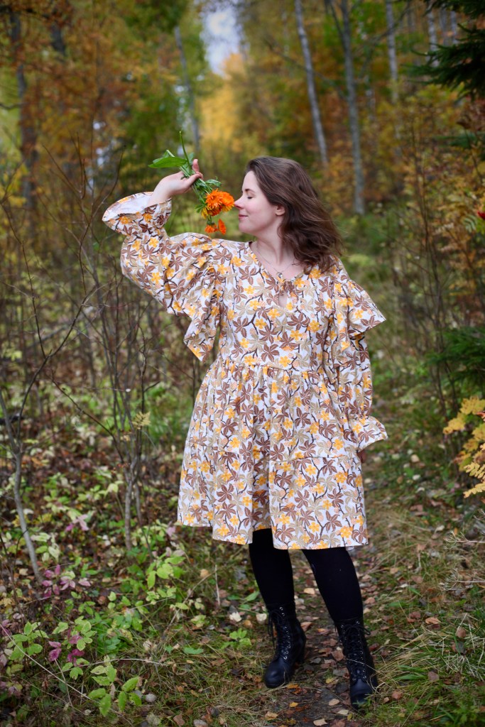 Mitt första försök att sy en blus till mig själv – det bidde ingen blus i storlek kvinna, utan en färgglad klänningen i storlek som passade den yngsta flickan i barnens kusinskara. Trots att storleken blev helt fel så gladdes jag åt den frihet som fanns i ärmarna och lekfullheten i designen. Såna kläder hittar man sällan i butikerna här i stan. Ingenstans alls hittar man ett plagg som är likadant som det man själv sytt.